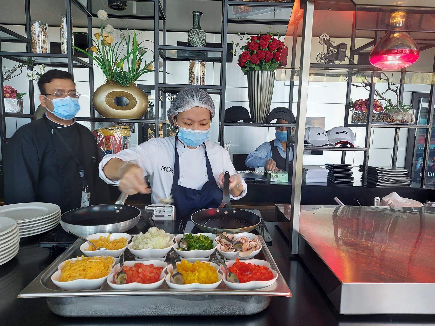 Between 10-11am, there’s a buffet breakfast spread. You get mini pastries, muffins, cupcakes. All that sweet stuff the kids love. Even a mini vegetarian burger. There’s a live station for omelettes and pancakes. As much tea and coffee as you like. Juice, infused water.