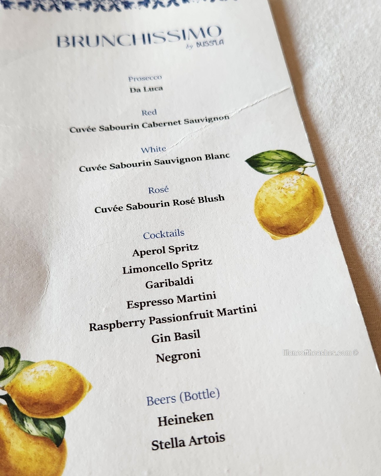 After parking the car, we walked uphill towards the very grand clubhouse, and into Bussola on the left. You will very likely spend sometime at the photo op just before the restaurant – with the lemon and foliage wall backdrop and chic bicycle up front. There’s also a cheeky floor-standing mirror for yet – more photos, because – why not. You have already spent so much time getting ready for brunch – make-up, hair, picking that perfect brunch outfit. Snap away.